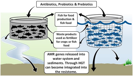 Antimicrobial agents are usually administered to fish, mixed with food, and doses can be proportionally higher than those in livestock [13]. Not only can residues of antimicrobials remain in fish products, but undigested food and fish faeces containing unabsorbed antimicrobials and secreted antimicrobial metabolites can remain in the water and sediment around fish farms for an extensive period of time, depending on their concentrations and biodegradability [19,59]. Indeed, some studies suggest that 70–80% of antibiotics given to fish are excreted into the water [17,20,60] and can further alter the microbial communities present [61]. Such material can persist and select for AMR bacteria, even at low concentrations [42], leading to major alterations in the biodiversity of the sediment and water in the near proximity of open aquaculture systems, by replacing susceptible communities of bacteria (and other microorganisms) with resistant ones ([13] and references therein). Not only is the biodiversity altered in the surrounding sediments, but the resistome also increases in complexity, with larger numbers of antibiotic resistance genes and increases in mobile genetic elements [40,62,63,64,65]. A schematic representation of these processes is shown in Figure 1.