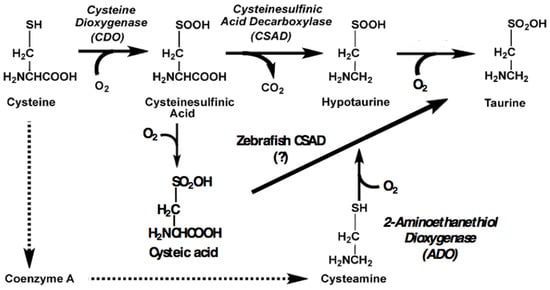 Knocking out the csad gene in mice leads to an 83% reduction in plasma levels of taurine, with resulting mortality within 24 h of birth by the third generation of inbred homozygotes [9]. Residual production of taurine may be via the cysteamine pathway (Figure 1). Cats, as insufficient synthesizers of taurine, exhibit retinal degeneration and hepatic lipidosis when fed a diet without taurine supplementation [2,3]. Taurine-deficient fish display similar liver maladies, largely expected since fish conjugate bile salts to taurine [5,6]. CSAD mRNA is found in the earliest stages of zebrafish embryonic development, including in the yolk at the gastrula stage, and in both the yolk and notochord in the somite and pharyngula stages. In the pharygula stage, 24–48 hpf (hours post fertilization), CSAD expression is evident in several additional tissues including the liver, brain, and optic cup [10,11]. Knockdown of CSAD mRNA or TauT (taurine transporter) mRNA during early embryonic development results in cardiomyopathy and mortality in zebrafish [11,12]. Taurine is also an immunomodulator, mitigating inflammation by scavenging free radicals and inhibiting the production of several potent inflammatory agents including tumor necrosis factor-α (TNF-α), interleukins, prostaglandins, superoxide anion, and nitric oxide [13,14].