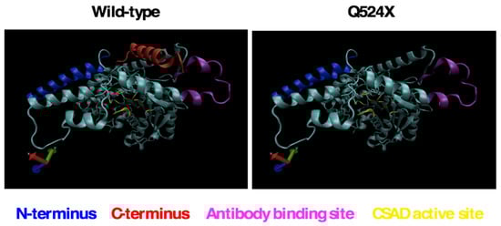 Computer modeling of the wild-type and sa9430 CSAD proteins suggest that a mutant protein, if properly folded and not degraded, may have a functional active site even if truncated (Figure 2). Specific amino acids in the ligand binding site are also predicted to be the same in the wild-type and mutant CSAD (data not shown).