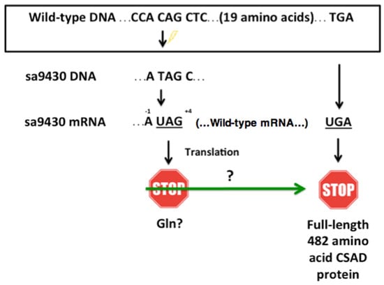 The sa9430 zebrafish strain has a premature UAG stop codon with adjacent nucleotides that may increase probability of a readthrough. The sa9430 zebrafish strain has a C→T point mutation that changes the codon CAG (codes for glutamine) to UAG (translational stop signal). The presence of an adenine residue −1 of the UAG and a cytosine +4 of the UAG may contribute to a readthrough of the stop codon. If readthrough occurs, translation should terminate at the wild-type UGA stop signal 20 codons downstream.