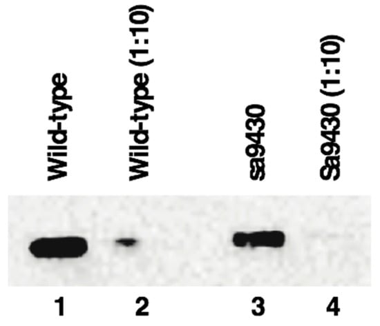 Liver proteins from wild-type and sa9430 zebrafish were extracted, genotypes confirmed, and immunoblotting performed. For genotyping, a 364-base region was sequenced which includes the site of the C→T point mutation in the sa9430 mutant. As shown in Figure 4, protein sizes are the same for detectable CSAD from both wild-type and sa9430. Immunoblotting of heterozygotes resulted in a single band of the same size (data not shown). The binding site for the anti-CSAD antibody is predicted to be present in a truncated CSAD in addition to the wild-type as shown in the protein models in Figure 2.