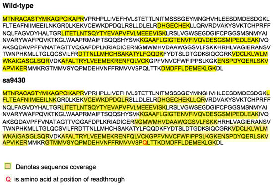 Total protein from liver extracts was immunopurified using an anti-CSAD antibody and prepared for mass spectrometry (MS). Peptides detected by tandem MS were aligned to the published CSAD sequence 482 amino acids in length (NP_001007349) as well as the predicted X1 isoform 544 amino acids in length (XP_009295318.1). The sa9430 zebrafish strain is producing full-length CSAD protein, with sequence coverage of 542 amino acids for both wild-type and sa9430 (Figure 5). The nonsense UAG in sa9430 is being translated to glutamine, the same amino acid as in the corresponding position in the wild-type. N-terminal sequence coverage matches the predicted X1 isoform.