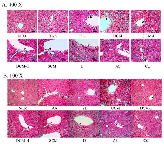 We conducted hematoxylin and eosin staining on liver sections to evaluate the damage to liver tissue. In Figure 1, the results of the stained section obtained from the NOR group indicated intact liver lobules. The hepatic plates were radially arranged. After the TAA injection, the structure of the liver lobules in the TAA group changed and the hepatic plate arrangements were disrupted. Substantial amounts of inflammatory microphages were concentrated around the blood vessels, presenting a severe inflammatory response. Some of the hepatocytes were undergoing apoptosis. The liver lobules of the mice in the DCM-L and DCM-H groups sustained considerably moderate damages compared with those of the mice in the TAA group; in these lobules, markedly fewer inflammatory microphages surrounded the blood vessels, and no hepatocytes presented with apoptosis. Furthermore, although the structures of the liver lobules in the SCM, AS, and CC groups were not intact, and the amounts of inflammatory microphages were clearly reduced. The reduction in the amounts of inflammatory microphages in the SL and D was less than that in the DCM-L group. In CM fermented with UPW (UCM), the liver tissue section results indicated that substantial amounts of inflammatory microphages accumulated around the blood vessels, and the hepatocytes were inclined to undergo apoptosis. No clear recovery effects in response to the damage caused by TAA were exhibited.