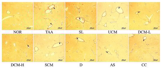 Figure 2 shows that the liver tissue of the NOR group demonstrated virtually no accumulation of collagen fiber. After the TAA injection, substantial amounts of collagen accumulated around the blood vessels, and fibrous substances were produced in the TAA group. The collagen fiber content in the liver tissue of the DCM-L, DCM-H, and CC groups was clearly lower than that in the TAA group. Although the SL, SCM, D, and AS groups exhibited reductions in the collagen fiber content, these reductions were lower than those observed in the DCM-L group. No substantial difference in the collagen fiber content was observed between the UCM and the TAA groups.