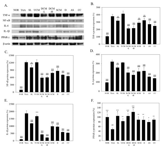 Previous study reported that PPAR-γ exhibits excellent anti-inflammatory capabilities [21]. In addition, increases in PPAR-γ levels can inhibit the activation of HSCs [22]. Synthesized PPAR ligands, such as thiazolidinediones, can inhibit the activation of HSCs and reduce the accumulation of collagen proteins [23]. In Figure 3A,F, compared with those in the NOR group, the PPAR-γ protein levels in the TAA group dropped by 48% (p < 0.001). After the administration of the test substances, PPAR-γ protein levels in the UCM, DCM-L, DCM-H, SCM, D, AS, and CC groups rebounded by 71% (p < 0.01), 116% (p < 0.001), 152% (p < 0.001), 84% (p < 0.01), 83% (p < 0.01), 63% (p < 0.05), and 84% (p < 0.01), respectively, compared with those in the TAA group. The SL group rebounded by 117%. Among the fermented products, DCM-H exhibited more favorable rebound effects than SCM and D did. This indicates that DOW enables CM to prevent liver fibrosis.