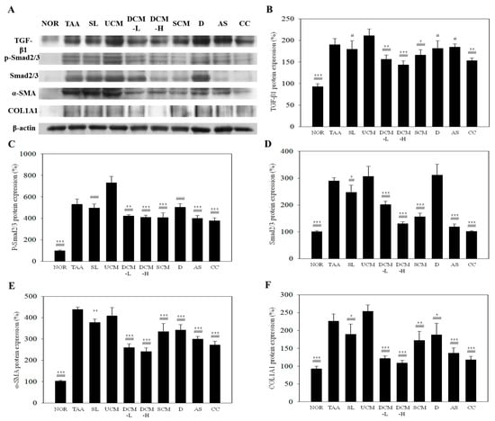 α-SMA levels can be considered as indicators of the existence of activated HSCs. Figure 4A,D shows the effects of the test substances on the α-SMA protein levels in liver tissue. Compared with that in the NOR group, the α-SMA protein levels in the TAA group increased by 4.25 times (p < 0.001). After the application of the test substances, the α-SMA protein levels in the DCM-L, DCM-H, SCM, D, AS, and CC groups dropped by 41% (p < 0.001), 45% (p < 0.001), 23% (p < 0.001), 22% (p < 0.001), 32% (p < 0.001), and 38% (p < 0.001), respectively, compared with that in the TAA group. The protein levels in the SL group dropped by 14% (p < 0.01). No significant reductions were observed in the UCM group (p > 0.05). DCM-H existing in the fermentation product exhibited a significantly more effective inhibitory effect compared with SCM (p < 0.01) and D (p < 0.001). These results show that CM fermented with DOW is effective at inhibiting the activation of HSCs and that DOW facilitates enhancing the liver protection capabilities of CM.
