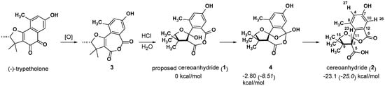 Recently, cereoanhydride was synthesized by Hu and co-workers [18,19]. In order to follow the biosynthetic route proposed by Wolfender and König, (±)-trypetholone was first synthesized in seven steps, and then exposed to Baeyer–Villiger oxidation conditions to produce 3. The NMR spectra of the product formed on exposing 3 to acid matched the NMR spectra reported for cereoanhydride. However, an X-ray structure of the isolated material corresponded to structure 2 instead, suggesting that the structure of cereoanhydride was initially misassigned. However, Hu and coworkers suggested that 2 was formed via 1 (the originally assigned structure) and intermediate 4, as shown in Figure 1.