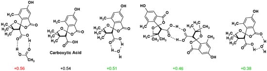 Given the match between the experimental shifts and those computed for the carboxylate form of 2, we hypothesized that deprotonated 2 may be present to some extent. On the basis of pKa values, however, this would be a very small amount. Another option is that hydrogen bonding to the carboxylic acid form would have a similar, although smaller, effect. To test this conjecture, several H-bonded complexes were modeled, including a dimer system, as carboxylic acids are known to dimerize in solution [23] (Figure 3). Although the deviations for the α proton improved for most of these, none were within our accepted values. A model of a carboxylic acid–carboxylate complex yielded acceptably close values for all proton and carbon signals. While we do not know how much carboxylate might actually be present in the experimental NMR sample, we can say that the observed chemical shifts are consistent with the carboxylate being present rather than absent, at least in the absence of an alternative explanation that has not yet come to light.