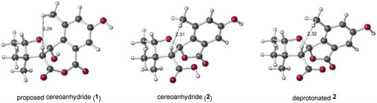 NOE data provided with the initial structural assignment show a correlation between the groups indicated in Figure 5 [15]. Wolfender, König, and co-workers computed a distribution of conformers for the proposed anhydride structure and found that the methyl and methine groups were close enough for this NOE interaction (although the exact distance found was not specified). NOE signals are usually only seen for distances of ≤5 Å. For the lowest energy conformers computed with DFT (Figure 5), the methyl-methine distance in the anhydride (3.29 Å), the acid (2.31 Å), and the carboxylate (2.32 Å) are all short enough that NOEs could be observed. While this structural argument is not definitive, it is consistent with the chemical shift argument for (deprotonated) 2 described above.