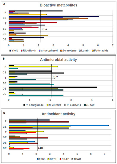 A Plackett–Burman design was used for the six experimental factors generating 12 experimental conditions tested with triplicates carried out in randomized run order. In this design, all six factors were tested at two different experimental levels: CX (g/min 4, 11); P (bar 150, 450); SX (min 5, 15); DX (min 25, 55); T (°C 40, 60); and, Di (g 0, 35). The response variables were extraction yield and the concentration of tocopherols, carotenoids, water-soluble vitamins (B-vitamins) and fatty acids. Antimicrobial activity against P. aeruginosa, S. aureus, C. albicans and E. coli and antioxidant activity through Folin–Ciocalteau, DPPH, FRAP and TEAC assays were also included. The results of each response variable and their statistical significance were analyzed with ANOVA (p > 0.05), using the statistical package Minitab 16 (State College, PA, USA).