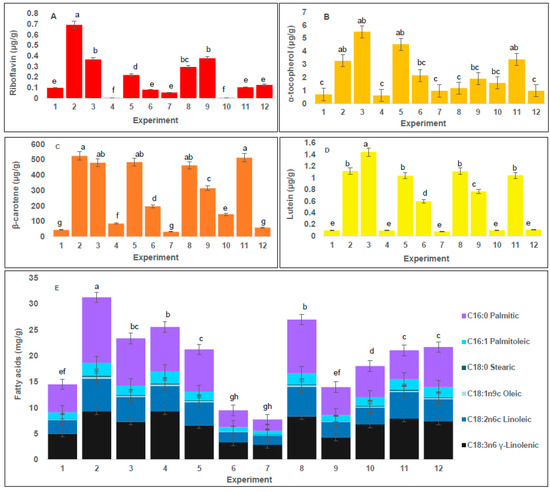 Bioactive metabolites content of SFE extracts of Arthrospira platensis: (A) Riboflavin (μg/g); (B) α-tocopherol (μg/g); (C) β-carotene (μg/g); (D) Lutein (μg/g); and (E) Fatty acids (mg/g). Values are presented as a mean ± standard deviation (n = 3). Bars with different letters correspond to values that are significantly different (Least Significant Difference LSD test, p < 0.05). All results are expressed in terms of percentage on dry basis (dw).
