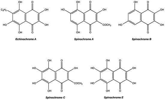 Although secondary metabolites remain ill-defined, they are commonly considered as natural and organic molecules that are not directly involved in the growth or in the reproduction of living organisms []. Instead, they are known to increase the survival rates of organisms producing them []. Secondary metabolites play various roles: they serve as defensive molecules against parasites or predators, as mediators between symbiotic organisms [], as sexual hormones or as transporting agents []. Due to their interesting bioactive activities, secondary metabolites are now increasingly considered for applications in pharmacological and agrochemical industries [] Oceans, covering 71% of the earth’s surface and being the birthplace of life, undoubtedly represent the largest potential reservoir for original and recoverable molecules []. Among numerous phyla occurring in marine environments, echinoderms contain many particularly interesting compounds like PolyHydroxyNaphthoQuinones (PHNQ) involved in the sea urchin’s pigmentation []. Also known as spinochromes or echinochromes, these molecules are present in every organ of sea urchins [,]). About thirty different molecular structures are already identified in the literature and are principally derivatives of polyhydroxy-1,4-naphthoquinones substituted with ethyl, acetyl, methoxy or amino groups. The most common spinochromes are named with letters (Echinochrome A and Spinochromes A–E) [,,,].