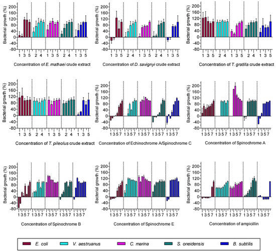 Growth (%) of bacteria incubated in medium containing sea urchin crude extracts or isolated spinochromes. Isolated spinochromes and ampicillin concentrations are expressed as 1 = 1000 μM; 2 = 500 μM; 3 = 200 μM; 4 = 100 μM; 5 = 40μM; 6 = 20 μM; 7 = 4 μM; 8 = Negative control. Crude extract concentrations are expressed as 1 = 2000 μG/mL; 2 = 1000 μG/mL; 3 = 200 μG/mL; 4 = 100 μG/mL; 5 = 1 μG/mL. Data are expressed as the mean ± one standard deviation of 3 independent experiments for each sample concentration.