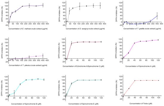DPPH inhibition (%) of sea urchin crude extracts (n = 9) and isolated spinochromes (n = 6). Data are expressed as the means ± one standard deviation of n independent experiments for each concentration of a sample.
