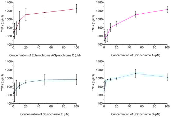 Production of TNF-α by response from J774 macrophages incubated with isolated spinochromes and stimulated with LPS. Data are expressed as the means ± one standard deviation of 3 independent experiments for each sample concentration.