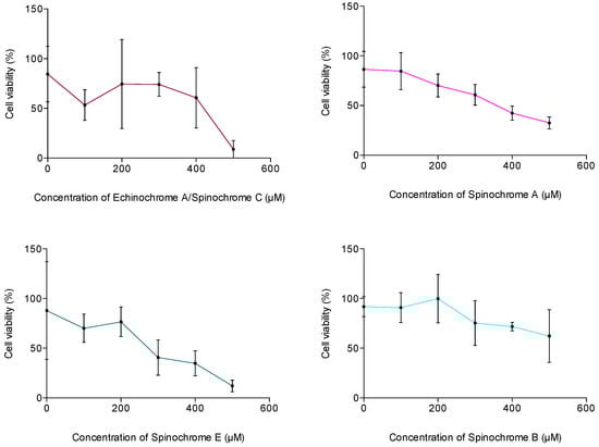 Cell viability (%) of HeLa cells incubated with increasing doses of isolated spinochromes. Data are expressed as the means ± one standard deviation of 3 independent experiments for each sample concentration.