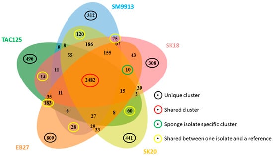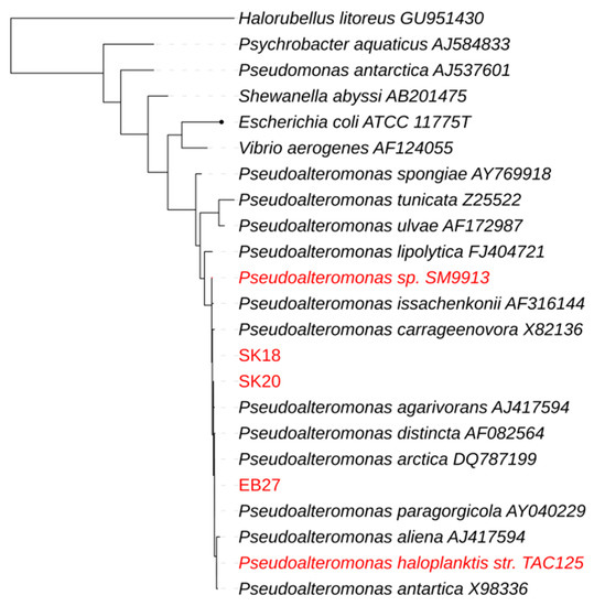 The Bacterial Pan Genome Analysis (BPGA) pan-genome pipeline was used to compare the whole genome sequences (Figure 1) [49]. Pseudoalteromonas haloplanktis TAC125 was used as a reference strain representing a shallow water isolate and Pseudoalteromonas sp. SM9913 was used as a deep sea reference strain as it had been retrieved from a deep sea sediment sample (1855 m) [21,46]. A phylogenetic comparison of the 16S rRNA gene of the isolates, reference strains, and a number of relevant type strains defined our isolates as true Pseudoalteromonas spp. (Figure 2). The 16S rRNA genes from the reference strains used for the whole genome comparison in this study were identified from the respective genomes by RNAmmer [50]. Due to the not fully assembled genomes (only one 16S rRNA copy in SK18 and EB27) of the isolates SK18, SK20, and EB27, the 16S rRNA gene sequences were retrieved by PCR. A pan-genome analysis, based on the comparison of all translated protein sequences, was then performed. The number of translated protein sequences present ranged from 3422 for Pseudoalteromonas haloplanktis TAC125 to 3941 for Pseudoalteromonas sp. EB27, with 2482 of these proteins being orthologs; making up 72.5% of the smallest genome and 62.9% of the largest genome. The number of unique proteins or paralogs is quite large, ranging from 308 to 809. The sponge isolates share 10 protein clusters not found in the free-living reference strains TAC125 and SM9913. These clusters include genes potentially encoding cation efflux proteins, integrases, recombinases, and proteins potentially involved in multidrug resistance and which may play a role in helping the Pseudoalteromonas strains adapt to life inside the sponge, and in helping them cope with other microorganisms inhabiting the sponge. For example, recombinases and integrases are known to mediate horizontal gene transfer, which is believed to play a key role in the genomic evolution of symbionts [51]. When comparing the individual isolates to the reference strains, EB27 shared 183 clusters with TAC125 and only 28 with SM9913, while SK18 shared 14 clusters with TAC125 and 75 clusters with SM9913. In addition, SK20 shared 60 clusters with TAC125 and 120 clusters with SM9913.
