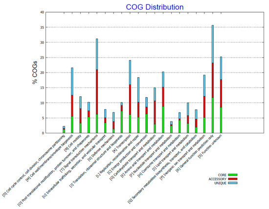 The pan-genome of the investigated isolates is open and each genome contains 8.5 to 20% unique genes and the core genome comprises of 2482 genes (Figure 1), whereas the whole pan genome comprises of 6077 genes. The possible functions of the translated genes have been investigated by assigning them to clusters of orthologous function. The distribution of the unique, accessory, and core genes is widespread across different biological functions and no obvious pattern is evident, besides core functions that seem to be conserved in all genomes such as cell cycle control, cell division, chromosome partitioning, translation, ribosomal structure, biogenesis, and nucleotide transport and metabolism (Figure 3).