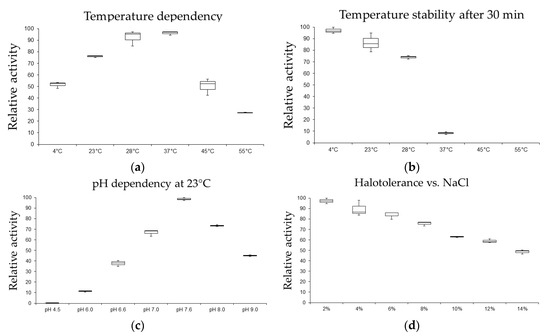 Optimal temperature (a), temperature stability (b), pH dependency (c) and halotolerance (d) assay results of a heterologously expressed β-glucosidase from the Pseudoalteromonas sp. EB27. The highest activity per assay was set as 100% activity and the other values were calculated accordingly. The highest total activity was measured as 2.5 U/mg of β-glucosidase at pH 7.6 and 28 °C.