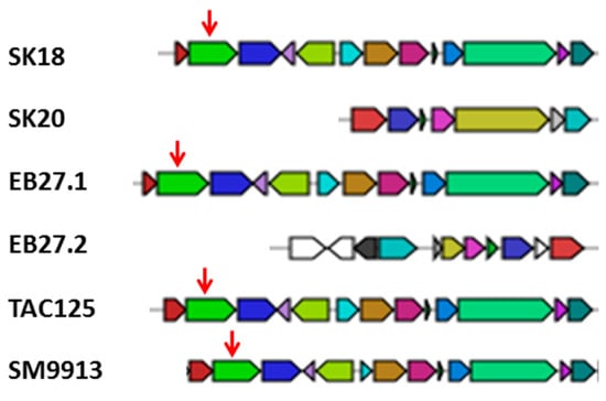 In addition, when TAC125 and SM9913 were subsequently analysed, one potential bacteriocin gene cluster was found to be present and highly conserved between the different isolates and the reference genomes (Figure 6). This gene cluster consists of 13 different genes with an average total size of 10.8 kb, except in SK20, in which the cluster only consists of seven genes with a total of 6.1 kb (Figure 6). In addition to the conserved bacteriocin gene cluster that can be found in all isolates, EB27 has a second small bacteriocin gene cluster spanning 10 kb, which is considerably different than the other clusters and is not a reduced form of the conserved cluster as in SK20.