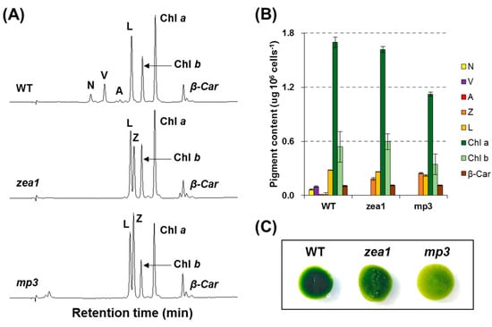 Pigment characteristics of wild type and mutant D. tertiolecta strains. (A) HPLC elution profile of total pigment extracts from the wild type, zea1, and, mp3 mutant; (B) Pigment composition per 106 cells (n = 3); (C) Colony color at the same cell density. N, neoxanthin; V, violaxanthin; A, antheraxanthin; Z, zeaxanthin; L, lutein; Chl a, chlorophyll a; Chl b, chlorophyll b; β-Car, β-carotene.