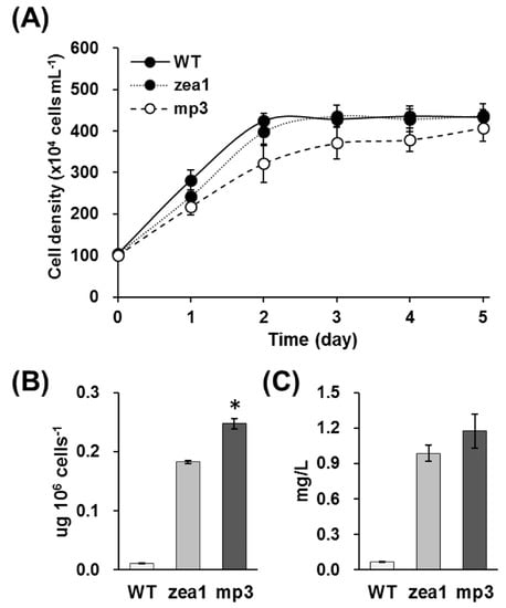 Comparative analysis of D. tertiolecta wild type, zea1, and mp3. (A) Growth patterns of three strains on 1.5 M NaCl medium; (B) Cellular zeaxanthin content of three strains (μg·106·cells−1); (C) Zeaxanthin yield of three strains (mg·L−1). Statistical analyses were performed using Student’s t-test, * p < 0.05. All experiments were conducted in triplicate.