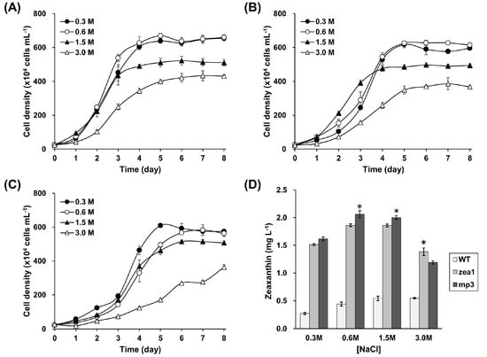 Cell size was similar under different saline conditions; however, cell growth pattern, zeaxanthin content, and biomass were largely affected by salinity of the medium (Figure 3, Table S1). The maximal cell density at 0.3 M NaCl was similar to that at 0.6 M in the stationary phase (Figure 3A–C). However, the highest specific growth rate (μ) of the wild type reached 0.72 d−1 at 0.6 M NaCl; under the same conditions, the specific growth rate of mp3 was 0.46 d−1. Specific growth rates were calculated during the exponential phase for the wild type (days 1–3) and mp3 (days 3–6). Zeaxanthin yield seemed to be affected by salinity (Figure 3D). Table 1 shows the carotenoid content per 106 cells at different salinities. In the wild type, low salinity-adapted cells tended to have high neoxanthin, violaxanthin, and antheraxanthin contents, but they tended to have low zeaxanthin content. Zeaxanthin content of both zea1 and mp3 mutants also tended to be reduced with decreasing salinity. The maximal cell density of all strains was observed at both 0.3 M and 0.6 M NaCl, but zeaxanthin content was highest at 3.0 M in the wild type, and at 1.5 M in the zea1 and mp3 mutants. Zeaxanthin yield (mg·L−1) of mp3 was significantly higher than that of zea1 at 0.6 M and 1.5 M NaCl (Figure 3). Zeaxanthin yield of mp3 was 7%, 11%, and 8% higher than that of zea1 at 0.3 M, 0.6 M, and 1.5 M NaCl, respectively, but was 14% lower at 3.0 M NaCl. Because the highest zeaxanthin yield of mp3 occurred in a medium containing 0.6 M NaCl, we considered this medium as optimal for zeaxanthin production (Figure 3D).
