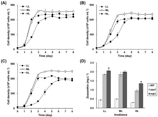 Effects of light intensity on growth and zeaxanthin production in wild type D. tertiolecta, and zea1 and mp3 mutants. Experimental light conditions were low-light (LL), mid-light (ML), and high-light (HL). Growth patterns of wild type (A), zea1 (B), and mp3 (C); (D) Zeaxanthin yield of wild type, zea1, and mp3. Dunaliella strains were cultured on media containing 0.6 M NaCl. Statistical analyses were performed using Student’s t-test, * p < 0.05. All experiments were conducted in more than triplicate.