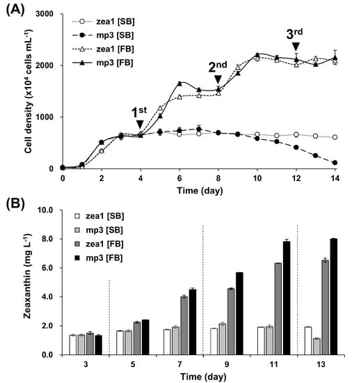 Comparison between single-batch (SB) and repeated fed-batch (FB) culture systems. Total replacement of the culture medium was conducted three times; on day 4 (1st), day 8 (2nd), and day 12 (3rd). (A) Growth patterns of zea1 and mp3. Growth was improved at the previous two points but did not increase by more than 2500 × 104 cells·mL−1; (B) Zeaxanthin yield of zea1 and mp3 according to two culture systems. The culture conditions are presented in detail in materials and methods.