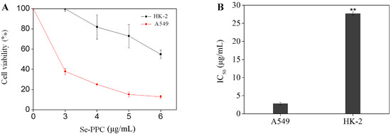 (A) Cytotoxic effects of Selenium-containing polysaccharide-protein complex (Se-PPC) on A549 human lung cancer cells and normal cells (HK-2 human renal tubular epithelial cells). Data are expressed as the decrease in cell viability (for MTT assay); (B) Growth inhibition of Se-PPC was expressed as the IC50 (for MTT assay). Each IC50 value represents the mean ± SD of three independent experiments. Cells were treated with Se-PPC for 72 h. All values were obtained at least from three independent experiments. Difference between normal cells and cancer cells with p < 0.01 (**) was considered statistically significant.