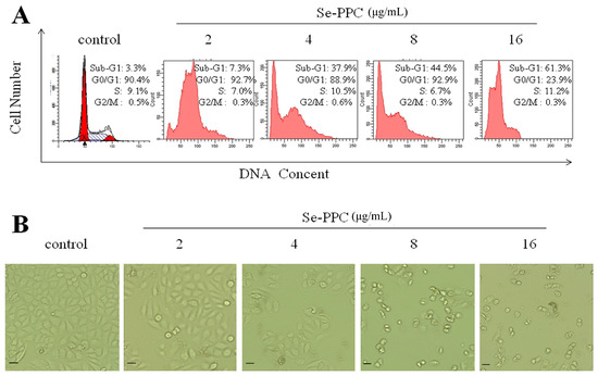 Cell cycle distribution was monitored by flow cytometry. Briefly, cells treated with or without Se-PPC were harvested by centrifugation and washed with PBS. Cells were stained with PI after fixation with 70% ethanol at −20 °C overnight. Labelled cells were washed with PBS and then analyzed by the flow cytometer. The cell cycle distribution was analyzed using MultiCycle software (Phoenix Flow Systems, San Diego, CA, USA). The proportions of cells in G0/G1, S, and G2/M phases were represented in DNA histograms. Apoptotic cells with hypodiploid DNA content were measured by quantifying the sub-G1 peak. For each experiment, 10,000 events per sample were recorded.