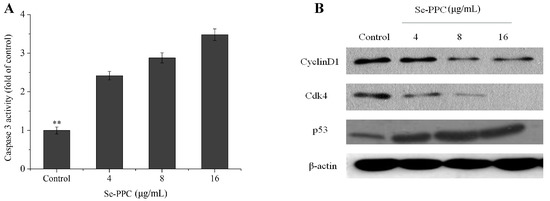 (A) Effect of Se-PPC on caspase-3 activity of A549 cells; (B) Effect of Se-PPC on cyclin-dependent kinase 4, Cyclin D1, and p53 protein expression of A549 cells. The values represent means ± SD of triplicate determinations. Difference between treatment and control cells with p < 0.01 (**) was considered statistically significant.
