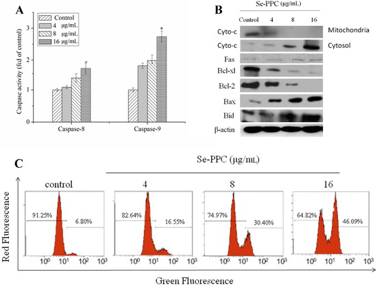 Generally, apoptosis occurs via death receptor-dependent (extrinsic) or mitochondrial (intrinsic) pathways. The mitochondrial pathway of cell death is mediated by Bcl-2 family proteins which disrupt the mitochondria membrane potential and result in release of apoptogenic factors such as cytochrome c, Smac/Diablo, and AIF, into the cytosol [28]. Cytochrome c then forms an apoptosome containing apoptosis activating factor 1 and caspase-9, which then activates the downstream apoptotic signals [22]. In this content, we examined the cytochrome c levels in cytosol fractions of cells treated with Se-PPC at doses of 4, 8, and 16 μg/mL. The result of western blot showed that the cytosolic cytochrome c protein expression increased markedly in a dose-dependent manner in Se-PPC-treated cells (Figure 4B). Since release of cytochrome c into the cytosol is usually preceded or accompanied by a loss or disruption of mitochondrial membrane potential and this collapse is an essential step occurring in cells undergoing apoptosis [29]. Loss of ΔΨm is associated with the activation of caspases and the initiation of apoptotic cascades. Thus, the status of mitochondria in A549 cells exposed to Se-PPC was investigated by JC-1 flow cytometric analysis. It was found that Se-PPC induced significant depletion of ΔΨm in A549 cells (Figure 4C). The percentage of cells with depolarized mitochondria increased from 6.80% (control) to 16.55% (4 μg/mL), 30.40% (8 μg/mL), and 46.09% (16 μg/mL), respectively.