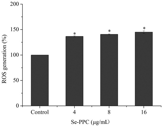 ROS overproduction in A549 cells induced by Se-PPC as determined by DCF fluorescence assay. Cells were treated with indicated concentrations of Se-PPC for 24 h. All experiments were carried out at least in triplicate. Difference between treatments and control with p < 0.05 (*) was considered statistically significant.