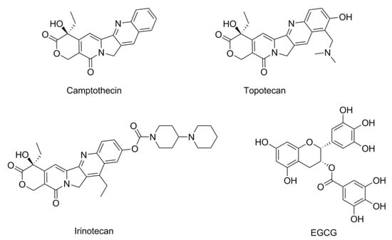 To date, a large number of Topo-directed agents (e.g., camptothecin (CPT), topotecan, and irinotecan—Figure 1) are known which are currently in clinical use [,]. However, their utilities are limited due to the fact that they induce severe toxic side effects such as myelosuppression, nausea, hair loss, congestive heart failure, and in some cases, increase the risk of secondary malignancies [,]. Recently, epigallocatechin-3-gallate (EGCG)—a major polyphenolic constituent in green tea—has received much attention as a potential cancer chemopreventive agent with Topo I inhibitory activity (Figure 1) [,,]. At physiologically attainable concentrations, EGCG exerts growth inhibitory effects on several human tumor cell lines, without affecting normal cell lines, resulting in a dose-dependent inhibition of cell growth []. Notably, EGCG possessed low cytotoxicity with much higher half maximal inhibitory concentration (IC50) to human tumor cell lines than the traditional Topo-directed agents []. Therefore, low cytotoxic compounds may have the potential with Topo I inhibitory activity and provide the possibility for searching for novel, nontoxic Topo I inhibitors.
