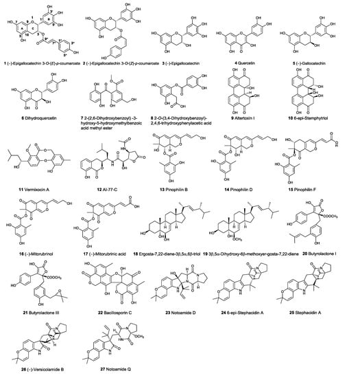 In our previous studies, hundreds of antitumor natural products have been isolated from marine invertebrates, plants, and their symbiotic microorganisms [,,,]. During the course of discovering antitumor compounds, a collection of natural products with low cytotoxic or non-cytotoxic activity were also identified. In the present study, from these low cytotoxic and non-cytotoxic natural products, Topo I inhibitors were discovered based on virtual screening with docking simulations in combination with bioassay test. By this approach, eight potent Topo I inhibitors with low cytotoxic or non-cytotoxic activity were found from the natural products isolated from coral-derived fungi and plants.