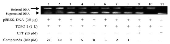 DNA Topo I inhibitory activities of (−)-epigallocatechin 3-O-(E)-p-coumaroate (1), (x)-epigallocatechin 3-O-(Z)-p-coumaroate (2), (−)-epigallocatechin (3), quercetin (4), (−)-gallocatechin (5), altertoxin I (9), 6-epi-stemphytriol (10), and bacillosporin C (22) at 100 µM. Lanes 1–8: DNA + Topo I + tested compounds; lane 9: DNA + Topo I + CPT; lane 10: DNA + Topo I; lane 11: DNA.