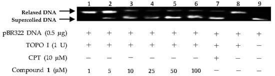 DNA Topo I inhibitory activity of (−)-epigallocatechin 3-O-(E)-p-coumaroate (1) at various concentrations (1, 5, 10, 25, 50, and 100 µM). Lanes 1–6: DNA + Topo I + compound 1 at various concentrations; lane 7: DNA + Topo I + camptothecin (CPT); lane 8: DNA + Topo I; lane 9: DNA.