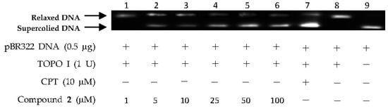 DNA Topo I inhibitory activity of (−)-epigallocatechin 3-O-(Z)-p-coumaroate (2) at various concentrations (1, 5, 10, 25, 50 and 100 µM). Lanes 1–6: DNA + Topo I + compound 2 at various concentrations; lane 7: DNA + Topo I + CPT; lane 8: DNA + Topo I; lane 9: DNA.