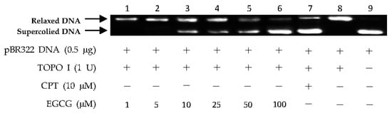 DNA Topo I inhibitory activity of epigallocatechin-3-gallate (EGCG) at various concentrations (1, 5, 10, 25, 50, and 100 µM). Lanes 1–6: DNA + Topo I + EGCG at various concentrations; lane 7: DNA + Topo I + CPT; lane 8: DNA + Topo I; lane 9: DNA.