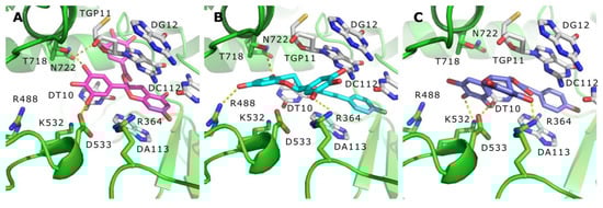 Although the three flavonoids—(−)-epigallocatechin 3-O-(E)-p-coumaroate (1), (−)-epigallocatechin 3-O-(Z)-p-coumaroate (2), and EGCG—could bind with the Topo I active sites, EGCG shared a different conformation in the active site of Topo I (Figure 8). The benzopyrone moiety of EGCG could deeply intercalate at the DNA cleavage site and stack with the base pairs. Different from EGCG (Figure 8A), in compound 1, the 5-hydroxyloxygen atom and 7-hydroxyloxygen atom at benzopyrone moiety could form hydrophobic interactions with the surrounding hydrophobic residues, Asn 722 and Arg 488, respectively (Figure 8B). Additionally, the hydrogen bonding interaction was also observed between the 5-hydroxyloxygen atom of compound 2 and Arg364 (Figure 8C). In summary, compounds 1, 2, and EGCG have three common features binding to Topo I–DNA complex: (1) a planar aromatic ring could intercalate at the DNA cleavage site; (2) base stacking interactions could form between the ligands and the base pairs; (3) at least three hydrogen bonds could be formed between the ligand and the important residues of Topo I, such as Arg364, Asp533, and Thr718.