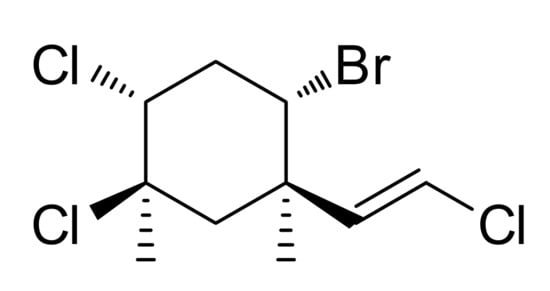 - Capon, R.; Engelhardt, L.; Ghisalberti, E.; Jefferies, P.; Patrick, V.; White, A. Structural studies of polyhalogenated monoterpenes from Plocamium species. Aust. J. Chem. 1984, 37, 537–544. [Google Scholar] [CrossRef]