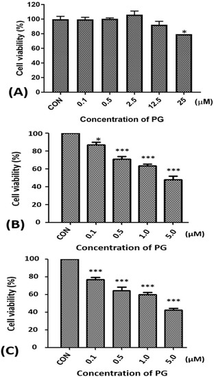 Cytotoxicity was measured by MTT assay. 7 × 103 cells per well of SAS/OECM1 were seeded in 96-well plates and incubated at 37 °C, 5% CO2 overnight. Then, the cells were treated with various concentrations of PG (0.1, 0.5, 1.0, and 5.0 μM) for 24 h. After treatment, 20 μL per well of 50 mg/mL MTT (Thermo-Fisher) solution was added and incubated at 37 °C for 3 h. As incubation finished, all liquid in wells were replaced to dimethyl sulfoxide and the absorbance at 570 nm was measured by EnSpire Alpha plate reader (Perkin Elmer, Waltham, MA, USA). The absorbance at 570 nm was positively correlated to the number of viable cells so the cell viability was represented as the percentage of absorbance at 570 nm between treated and untreated cells.
