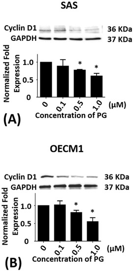 As SAS cells, sub-G1 phase of OECM1 cells in 12 h treatments of PG were not significantly different but G0/G1 phase of OECM1 cells was significantly increased from 50.9 ± 1.7% to 63.3 ± 0.4% (P < 0.05). S and G2/M phase of OECM1 cells were decreased from 16.6 ± 1.0% to 10.5 ± 0.2% and 32.1 ± 0.4% to 25.7 ± 0.8%, respectively (P < 0.05). In 24 h treatments of PG, sub-G1 phase of OECM1 cells was not significantly different but G2/M phase of OECM1 cells was decreased from 36.9 ± 3.1% to 18.7 ± 3.3%, respectively (P < 0.05). G0/G1 and S phase of OECM1 cells were increased from 47.9 ± 2.3% to 61.8 ± 0.4% and 14.0 ± 1.6% to 18.4 ± 2.6%, respectively (P < 0.05; Table 2). The above results indicated that PG might inhibit cell growth via arresting cell cycle in G0/G1 phase. The protein level of cyclin D1 was analyzed to ensure the hypothesis of cell cycle arrest. Cyclin D1 in two cell lines was significantly decreased after 0.5 and 1.0 μM of PG treatments, which was consistent with the result of cell cycle analysis (P < 0.05; Figure 2A,B). These findings indicated that PG could induce cell cycle arrest and delay cell cycle progression, which attributed to inhibitory growth effects of PG in oral cancer cells. In addition, the cell cycle distribution after PG stimulation was observed to arrest in G0/G1 phase of SAS cells with various concentrations of PG treatment for 12 h, and in G0/G1 phase of OECM1 cells with various concentrations of PG treatment for 12 and 24 h. The findings demonstrated that PG could induce type II program (autophagy) cell death in these cancer cells in a time- and dose-dependent manner. Moreover, there was no significant change of sub-G1 level in OECM1 and SAS cells after 24 h treatment of PG. We also discovered GFP-LC3 puncta formation in PG-treated OECM1 and SAS cells, which indicated an increase of autophagosome formation in two oral cancer cells (data not shown).