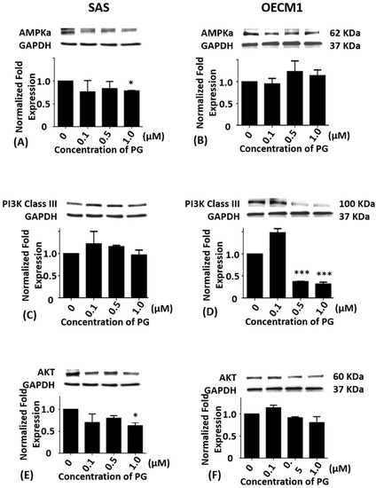 Altered protein levels of AMPKα, PI3K class III, and Akt of SAS and OECM1 cells treated with prodigiosin. SAS and OECM1 cells were treated with 0.1, 0.5, and 1.0 μM of prodigiosin (PG) for 24 h and lysed in RIPA buffer for Western blotting. Protein levels of AMPKα (A,B), PI3K class III (C,D), and Akt (E,F) were shown as the mean ± SEM of three independent experiments. Protein levels were represented as ratio of band intensity to untreated control which were normalized via internal control GAPDH. * P < 0.05 and *** P < 0.001 when compared with the untreated control (0 μM).