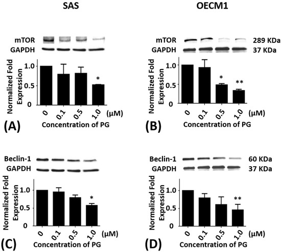 Altered protein levels of mTOR and Beclin-1 of SAS and OECM1 cells treated with prodigiosin. SAS and OECM1 cells were treated with 0.1, 0.5, and 1.0 μM of prodigiosin (PG) for 24 h and lysed in RIPA buffer for Western blotting. Protein levels of mTOR (A,B) and Beclin-1 (C,D) were shown as the mean ± SEM of three independent experiments. Protein levels were represented as ratio of band intensity to untreated control which were normalized via internal control GAPDH. * P < 0.05 and ** P < 0.01 when compared with the untreated controls (0 μM).