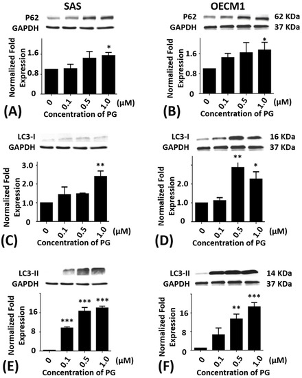 Altered protein levels of P62, LC3-I, and LC3-II of SAS and OECM1 cells treated with prodigiosin. SAS and OECM1 cells were treated with 0.1, 0.5, and 1.0 μM of prodigiosin (PG) for 24 h and lysed in RIPA buffer for Western blotting. Protein levels of P62 (A,B), LC3-I (C,D), and LC3-II (E,F) were shown as the mean ± SEM of three independent experiments. Protein levels were represented as ratio of band intensity to untreated control which were normalized via internal control GAPDH. * P < 0.05, ** P < 0.01, and *** P < 0.001 when compared with the untreated controls (0 μM).