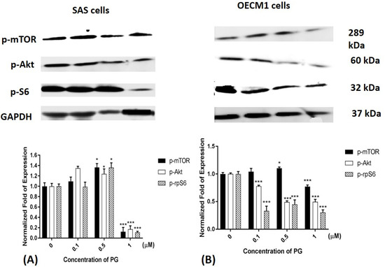 Previous studies have been shown that Akt and mTOR phosphorylation would be reduced while autophagy activation. Moreover, mTOR dephosphorylation reduced downstream protein p70S6K activation and finally inhibited ribosomal protein S6 (rpS6) phosphorylation [57,58,59]. Consequently, mTOR, Akt and rpS6 phosphorylation could be a marker of autophagy activation. After treatment of 1 μM PG, mTOR, Akt, and rpS6 phosphorylation in both SAS and OECM1 cells were significantly decreased (Figure 6). According to these results, PG could not only reduce mTOR and Akt protein expression, but also inhibit the phosphorylations of mTOR and Akt.