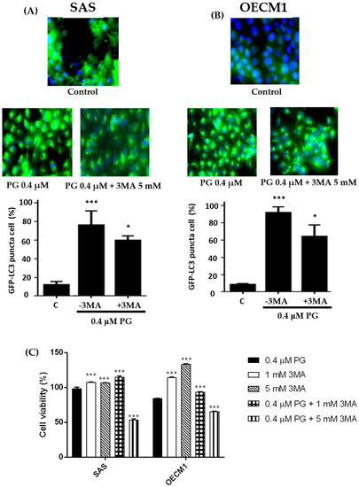 For evaluating whether autophagy appeared in oral cancer cells after PG treatment, the expressions of LC3-II in autophagosome in SAS and OECM1 cells were further observed via immunofluorescence. During the cascade of autophagy signal pathways, LC3-II can anchor on the autophagosome, and its amount is correlated well with the numbers of autophagosomes [8,14]. Two oral cancer cells were incubated with 0.4 μM PG and 0.4 μM PG plus 5 mM of autophagic inhibitor 3-methyladenine (3MA) for 24 h when compared with the untreated control cells. The results illustrated that increased LC3 puncta cells were significantly increased by presenting numerous autophagosomes in SAS and OECM-1 treated with PG and decreased by the application of 3MA. Figure 7A,B showed the quantitative representations of autophagosome formation in SAS and OECM1 cells (P < 0.05). Furthermore, in order to prove PG-induced OSCC cells death was caused by autophagy, cell viability of two OSCC cells were tested after PG treatment with or without 1 mM and 5 mM of 3MA. The data illustrated that cell viability of PG combined with 1 mM 3MA in two cell lines were significantly higher than that of PG alone. However, cell viability of PG combined with 5 mM 3MA was significantly lower than that of PG alone. Meanwhile, 1 and 5 mM of 3MA could increase two cell lines growth (Figure 7C). Previous study has been demonstrated biphasic function of 3MA in cell autophagy. In nutrient-rich environment, 3MA would promote the autophagy [60], which might explain the decrease of cell viability after treatment of 5 mM 3MA plus PG. Take all above results together, autophagy indeed occurred in oral cancer cells in the induction of PG.