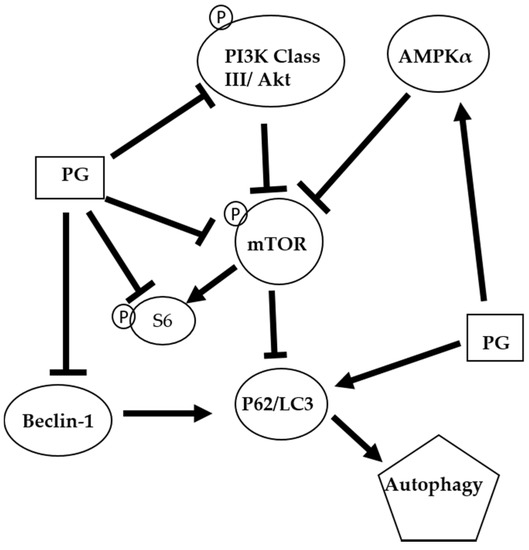 The autophagic mechanism of PG against oral cancer cells was proposed (Figure 8). PG might inhibit cell growth via suppressing the cyclin D1 to cause the arresting cell cycle in G0/G1 phase. Furthermore, PG could mediate AMPKα, PI3K class III/Akt signal pathway and directly or indirectly exerts the inhibition of mTOR and Beclin-1 and the induction of p62/LC3 resulting in cell autophagy. In the present study revealed that PG could induce autophagic cell death in human oral cancer cells by LC3-mediated P62/LC3-I/LC3-II pathway in vitro. Our findings elucidated the inhibitory role of PG in this OSCC cancer, which may target the autophagic pathways as a potential agent in cancer therapeutics. Further work in studying anticancer activity of PG should focus on the in vivo test of PG. In a lung cancer xenograft model in vivo studies have demonstrated cancer growth inhibition of tumor growth via cell apoptosis and invasion. Moreover, PG has inhibited RhoA and MMP-2 protein expression in lung cancer 95-D cell line resulting in invasion inhibition [65]. In addition, the activation of p73 and c-Jun-mediated ΔNp73 signaling pathway by PG induced, which can restore p53 tumor suppressor activity in colon cancer [28,66]. In breast cancer, PG could downregulate the Wnt/β-catenin signaling pathway, resulting in the triggered apoptosis process [67]. Based on the present study, this is the first evident that (1) autophagy-induced activity of PG; and (2) growth inhibiting activity of PG in OSCC. This study has confirmed that PG might have a chemotherapeutic potential and promise in treating oral squamous cell carcinoma.